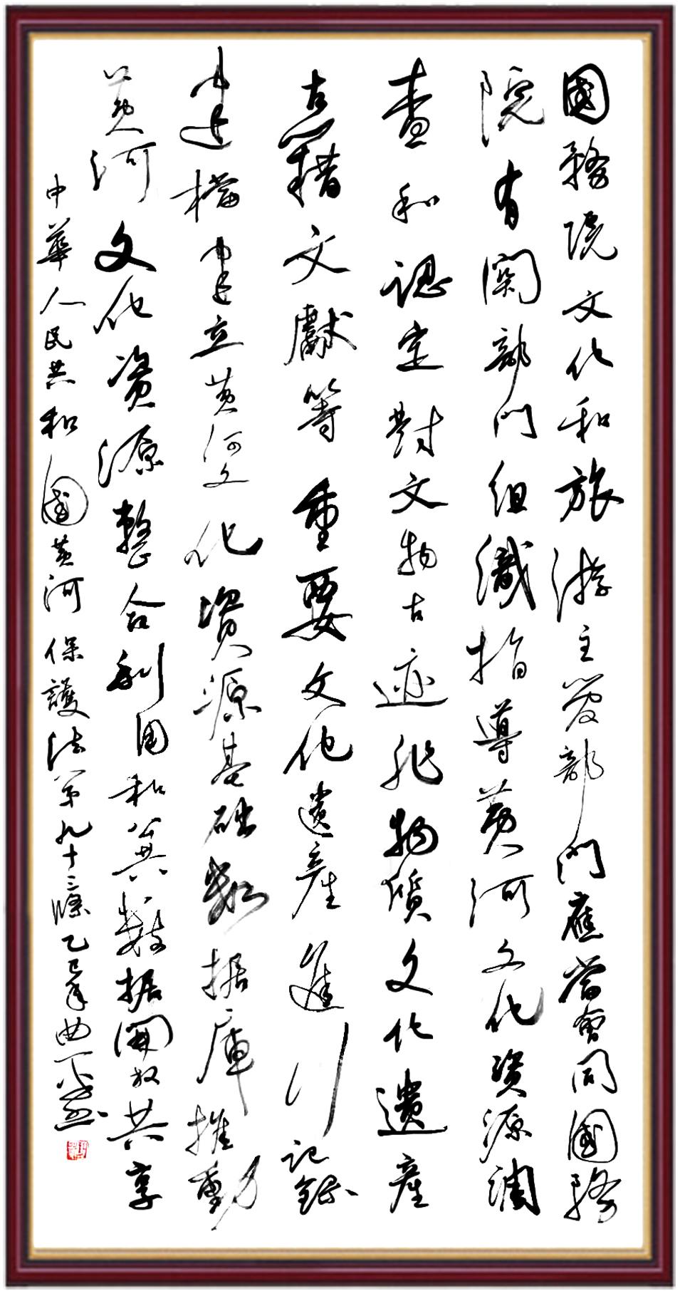 黃河寧,天下平。黃河是中華民族的發(fā)源地和搖籃,保護(hù)黃河是事關(guān)中華民族偉大復(fù)興的千秋大計(jì)?!吨腥A人民共和國(guó)黃河保護(hù)法》為推進(jìn)水資源節(jié)約集約利用、保護(hù)傳承弘揚(yáng)黃河文化、推動(dòng)黃河流域生態(tài)保護(hù)和高質(zhì)量發(fā)展提供了有力法治保障。繼書(shū)寫(xiě)《中華人民共和國(guó)民法典》《中華人民共和國(guó)憲法》《中華人民共和國(guó)澳門(mén)特別行政區(qū)基本法》《中華人民共和國(guó)香港特別行政區(qū)基本法》《中華人民共和國(guó)國(guó)旗法》《中華人民共和國(guó)國(guó)徽法》《中華人民共和國(guó)國(guó)歌法》《中華人民共和國(guó)法官法》等法律法規(guī)之后,法制日?qǐng)?bào)社聯(lián)合沿黃九省(區(qū))司法廳、書(shū)法家協(xié)會(huì),將筆端對(duì)準(zhǔn)《中華人民共和國(guó)黃河保護(hù)法》。