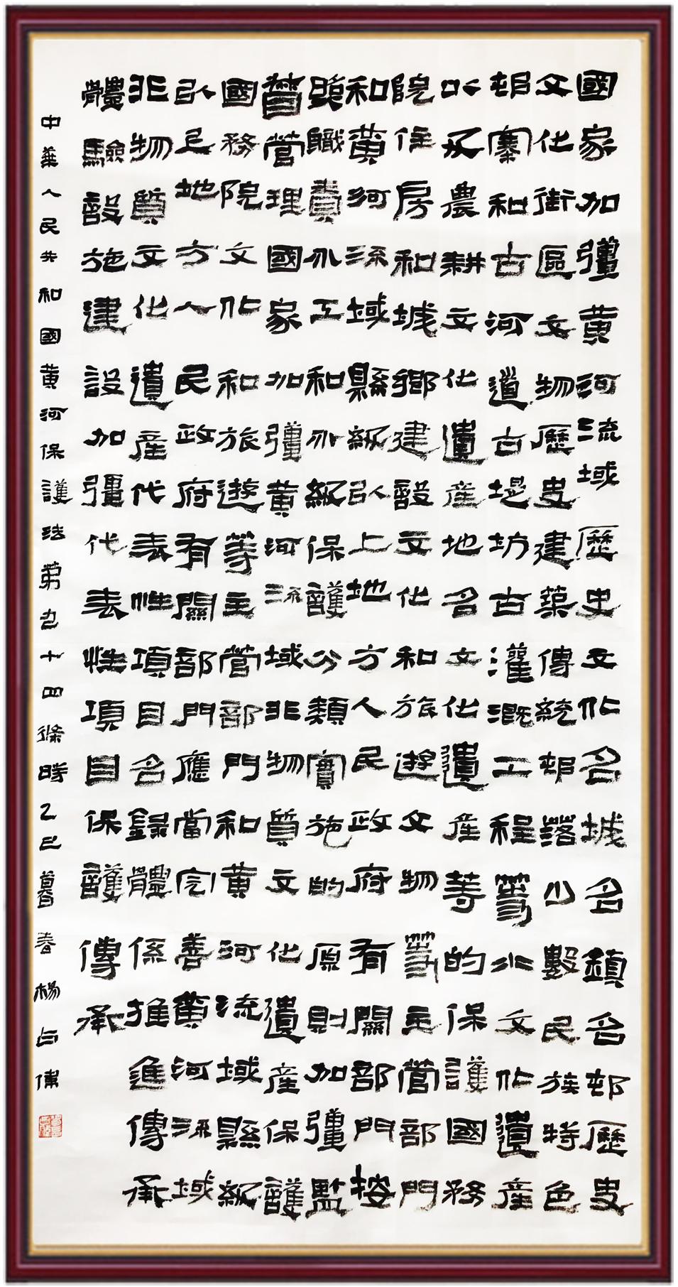 黃河寧,天下平。黃河是中華民族的發(fā)源地和搖籃,保護黃河是事關中華民族偉大復興的千秋大計?!吨腥A人民共和國黃河保護法》為推進水資源節(jié)約集約利用、保護傳承弘揚黃河文化、推動黃河流域生態(tài)保護和高質量發(fā)展提供了有力法治保障。繼書寫《中華人民共和國民法典》《中華人民共和國憲法》《中華人民共和國澳門特別行政區(qū)基本法》《中華人民共和國香港特別行政區(qū)基本法》《中華人民共和國國旗法》《中華人民共和國國徽法》《中華人民共和國國歌法》《中華人民共和國法官法》等法律法規(guī)之后,法制日報社聯(lián)合沿黃九?。▍^(qū))司法廳、書法家協(xié)會,將筆端對準《中華人民共和國黃河保護法》。