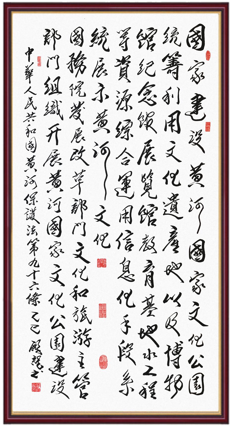 黃河寧,天下平。黃河是中華民族的發(fā)源地和搖籃,保護(hù)黃河是事關(guān)中華民族偉大復(fù)興的千秋大計(jì)?!吨腥A人民共和國黃河保護(hù)法》為推進(jìn)水資源節(jié)約集約利用、保護(hù)傳承弘揚(yáng)黃河文化、推動(dòng)黃河流域生態(tài)保護(hù)和高質(zhì)量發(fā)展提供了有力法治保障。繼書寫《中華人民共和國民法典》《中華人民共和國憲法》《中華人民共和國澳門特別行政區(qū)基本法》《中華人民共和國香港特別行政區(qū)基本法》《中華人民共和國國旗法》《中華人民共和國國徽法》《中華人民共和國國歌法》《中華人民共和國法官法》等法律法規(guī)之后,法制日?qǐng)?bào)社聯(lián)合沿黃九?。▍^(qū))司法廳、書法家協(xié)會(huì),將筆端對(duì)準(zhǔn)《中華人民共和國黃河保護(hù)法》。
