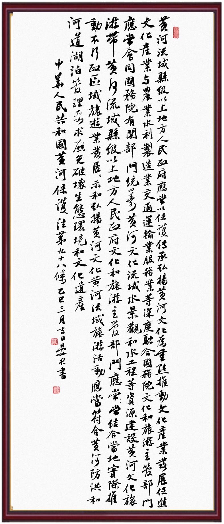 黃河寧,天下平。黃河是中華民族的發(fā)源地和搖籃,保護(hù)黃河是事關(guān)中華民族偉大復(fù)興的千秋大計(jì)?!吨腥A人民共和國黃河保護(hù)法》為推進(jìn)水資源節(jié)約集約利用、保護(hù)傳承弘揚(yáng)黃河文化、推動(dòng)黃河流域生態(tài)保護(hù)和高質(zhì)量發(fā)展提供了有力法治保障。繼書寫《中華人民共和國民法典》《中華人民共和國憲法》《中華人民共和國澳門特別行政區(qū)基本法》《中華人民共和國香港特別行政區(qū)基本法》《中華人民共和國國旗法》《中華人民共和國國徽法》《中華人民共和國國歌法》《中華人民共和國法官法》等法律法規(guī)之后,法制日報(bào)社聯(lián)合沿黃九?。▍^(qū))司法廳、書法家協(xié)會(huì),將筆端對準(zhǔn)《中華人民共和國黃河保護(hù)法》。