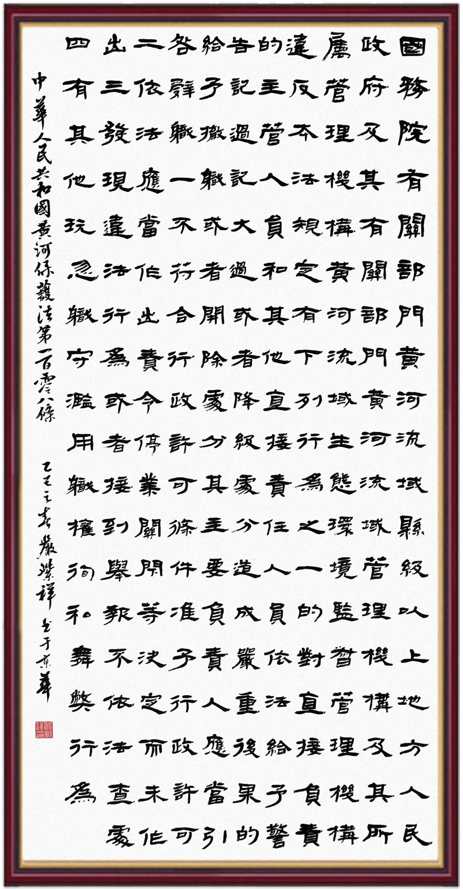 黃河寧,天下平。黃河是中華民族的發(fā)源地和搖籃,保護(hù)黃河是事關(guān)中華民族偉大復(fù)興的千秋大計?!吨腥A人民共和國黃河保護(hù)法》為推進(jìn)水資源節(jié)約集約利用、保護(hù)傳承弘揚(yáng)黃河文化、推動黃河流域生態(tài)保護(hù)和高質(zhì)量發(fā)展提供了有力法治保障。繼書寫《中華人民共和國民法典》《中華人民共和國憲法》《中華人民共和國澳門特別行政區(qū)基本法》《中華人民共和國香港特別行政區(qū)基本法》《中華人民共和國國旗法》《中華人民共和國國徽法》《中華人民共和國國歌法》《中華人民共和國法官法》等法律法規(guī)之后,法制日報社聯(lián)合沿黃九?。▍^(qū))司法廳、書法家協(xié)會,將筆端對準(zhǔn)《中華人民共和國黃河保護(hù)法》。
