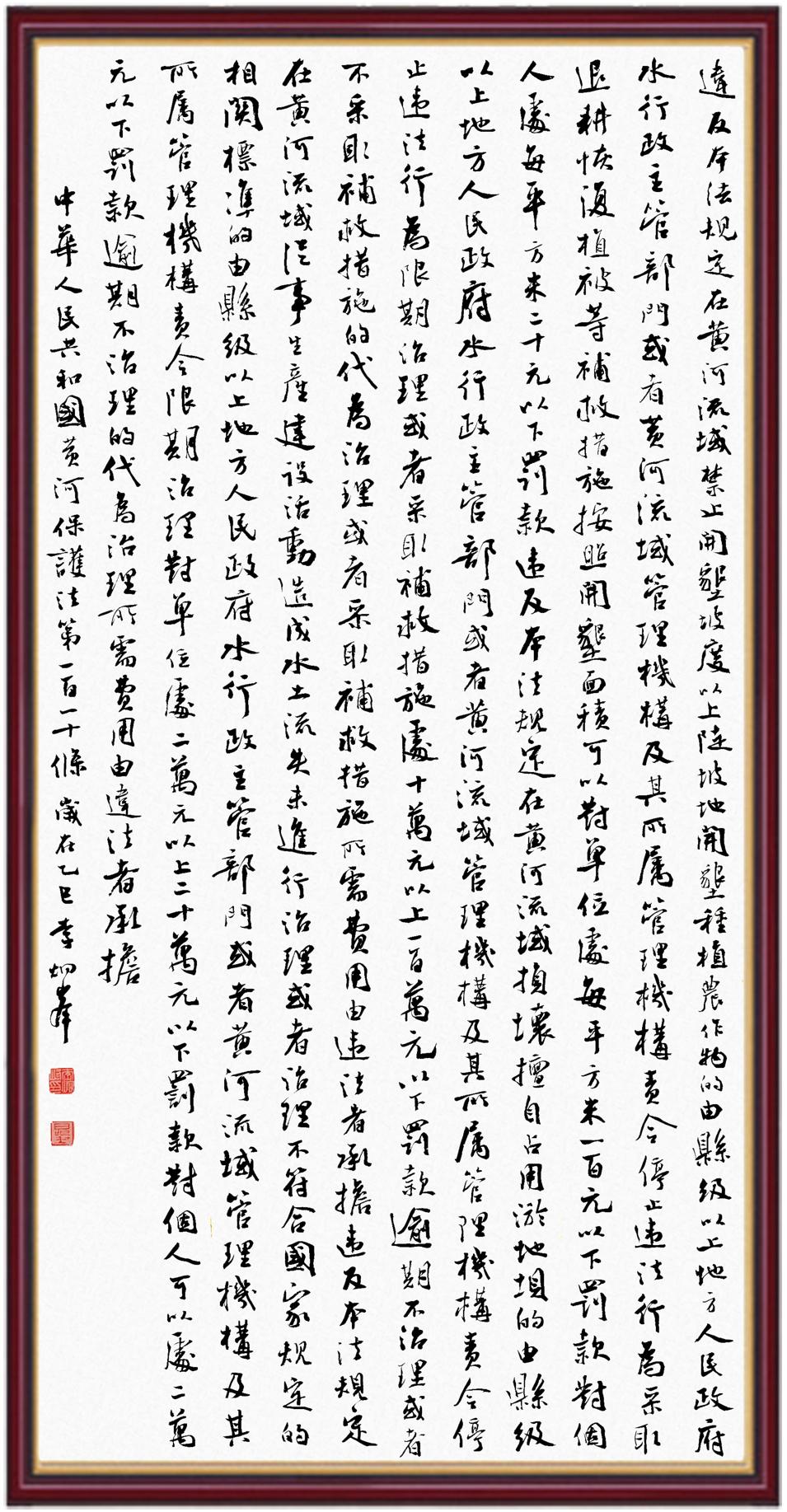 黃河寧,天下平。黃河是中華民族的發(fā)源地和搖籃,保護(hù)黃河是事關(guān)中華民族偉大復(fù)興的千秋大計(jì)?!吨腥A人民共和國黃河保護(hù)法》為推進(jìn)水資源節(jié)約集約利用、保護(hù)傳承弘揚(yáng)黃河文化、推動(dòng)黃河流域生態(tài)保護(hù)和高質(zhì)量發(fā)展提供了有力法治保障。繼書寫《中華人民共和國民法典》《中華人民共和國憲法》《中華人民共和國澳門特別行政區(qū)基本法》《中華人民共和國香港特別行政區(qū)基本法》《中華人民共和國國旗法》《中華人民共和國國徽法》《中華人民共和國國歌法》《中華人民共和國法官法》等法律法規(guī)之后,法制日報(bào)社聯(lián)合沿黃九?。▍^(qū))司法廳、書法家協(xié)會,將筆端對準(zhǔn)《中華人民共和國黃河保護(hù)法》。