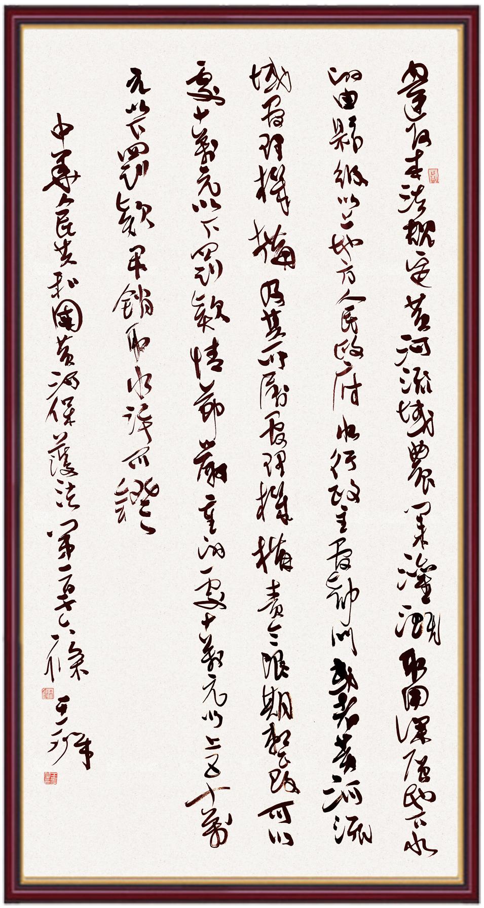 黃河寧,天下平。黃河是中華民族的發(fā)源地和搖籃,保護黃河是事關中華民族偉大復興的千秋大計?!吨腥A人民共和國黃河保護法》為推進水資源節(jié)約集約利用、保護傳承弘揚黃河文化、推動黃河流域生態(tài)保護和高質量發(fā)展提供了有力法治保障。繼書寫《中華人民共和國民法典》《中華人民共和國憲法》《中華人民共和國澳門特別行政區(qū)基本法》《中華人民共和國香港特別行政區(qū)基本法》《中華人民共和國國旗法》《中華人民共和國國徽法》《中華人民共和國國歌法》《中華人民共和國法官法》等法律法規(guī)之后,法制日報社聯合沿黃九?。▍^(qū))司法廳、書法家協(xié)會,將筆端對準《中華人民共和國黃河保護法》。