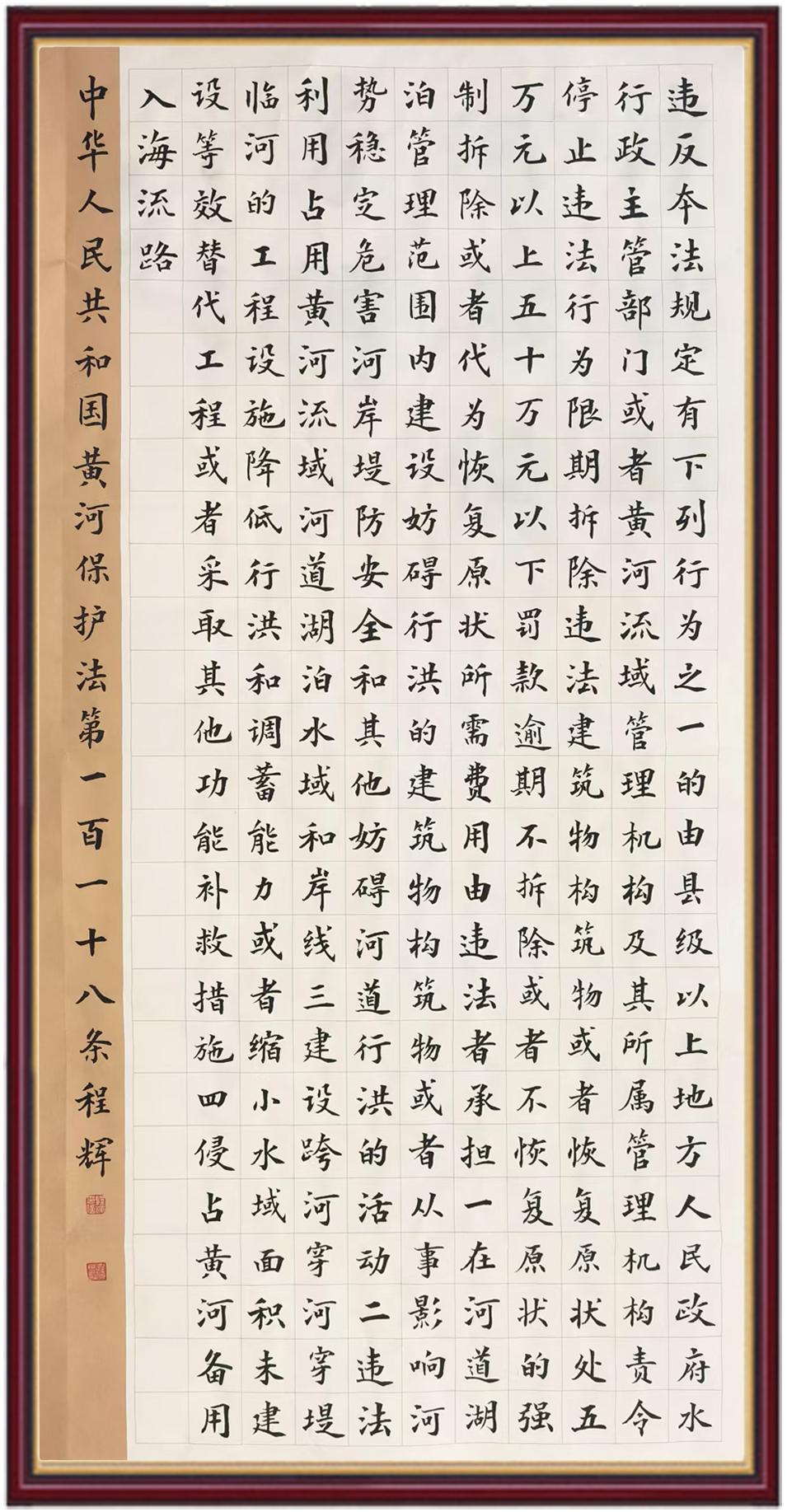 黃河寧,天下平。黃河是中華民族的發(fā)源地和搖籃,保護黃河是事關(guān)中華民族偉大復(fù)興的千秋大計。《中華人民共和國黃河保護法》為推進水資源節(jié)約集約利用、保護傳承弘揚黃河文化、推動黃河流域生態(tài)保護和高質(zhì)量發(fā)展提供了有力法治保障。繼書寫《中華人民共和國民法典》《中華人民共和國憲法》《中華人民共和國澳門特別行政區(qū)基本法》《中華人民共和國香港特別行政區(qū)基本法》《中華人民共和國國旗法》《中華人民共和國國徽法》《中華人民共和國國歌法》《中華人民共和國法官法》等法律法規(guī)之后,法制日報社聯(lián)合沿黃九?。▍^(qū))司法廳、書法家協(xié)會,將筆端對準《中華人民共和國黃河保護法》。