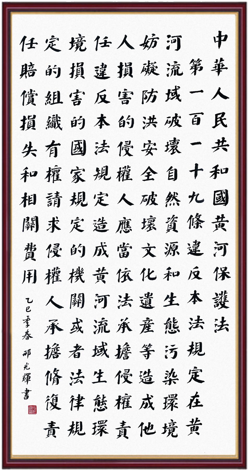 黃河寧,天下平。黃河是中華民族的發(fā)源地和搖籃,保護(hù)黃河是事關(guān)中華民族偉大復(fù)興的千秋大計(jì)?!吨腥A人民共和國黃河保護(hù)法》為推進(jìn)水資源節(jié)約集約利用、保護(hù)傳承弘揚(yáng)黃河文化、推動(dòng)黃河流域生態(tài)保護(hù)和高質(zhì)量發(fā)展提供了有力法治保障。繼書寫《中華人民共和國民法典》《中華人民共和國憲法》《中華人民共和國澳門特別行政區(qū)基本法》《中華人民共和國香港特別行政區(qū)基本法》《中華人民共和國國旗法》《中華人民共和國國徽法》《中華人民共和國國歌法》《中華人民共和國法官法》等法律法規(guī)之后,法制日報(bào)社聯(lián)合沿黃九?。▍^(qū))司法廳、書法家協(xié)會,將筆端對準(zhǔn)《中華人民共和國黃河保護(hù)法》。