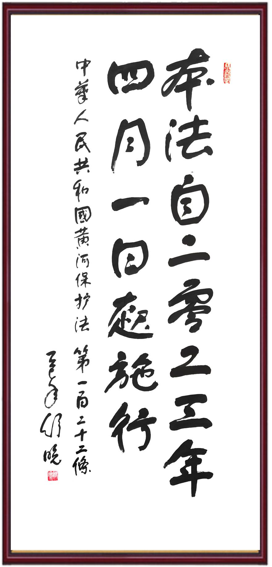 黃河寧,天下平。黃河是中華民族的發(fā)源地和搖籃,保護(hù)黃河是事關(guān)中華民族偉大復(fù)興的千秋大計(jì)。《中華人民共和國黃河保護(hù)法》為推進(jìn)水資源節(jié)約集約利用、保護(hù)傳承弘揚(yáng)黃河文化、推動(dòng)黃河流域生態(tài)保護(hù)和高質(zhì)量發(fā)展提供了有力法治保障。繼書寫《中華人民共和國民法典》《中華人民共和國憲法》《中華人民共和國澳門特別行政區(qū)基本法》《中華人民共和國香港特別行政區(qū)基本法》《中華人民共和國國旗法》《中華人民共和國國徽法》《中華人民共和國國歌法》《中華人民共和國法官法》等法律法規(guī)之后,法制日?qǐng)?bào)社聯(lián)合沿黃九?。▍^(qū))司法廳、書法家協(xié)會(huì),將筆端對(duì)準(zhǔn)《中華人民共和國黃河保護(hù)法》。