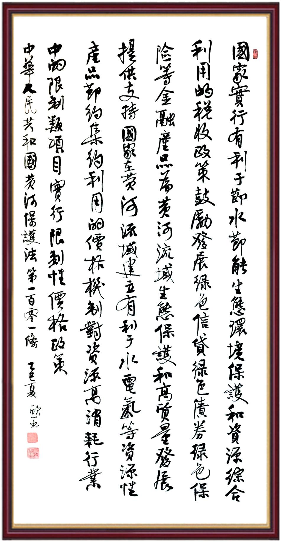 黃河寧,天下平。黃河是中華民族的發(fā)源地和搖籃,保護(hù)黃河是事關(guān)中華民族偉大復(fù)興的千秋大計(jì)。《中華人民共和國(guó)黃河保護(hù)法》為推進(jìn)水資源節(jié)約集約利用、保護(hù)傳承弘揚(yáng)黃河文化、推動(dòng)黃河流域生態(tài)保護(hù)和高質(zhì)量發(fā)展提供了有力法治保障。繼書(shū)寫(xiě)《中華人民共和國(guó)民法典》《中華人民共和國(guó)憲法》《中華人民共和國(guó)澳門(mén)特別行政區(qū)基本法》《中華人民共和國(guó)香港特別行政區(qū)基本法》《中華人民共和國(guó)國(guó)旗法》《中華人民共和國(guó)國(guó)徽法》《中華人民共和國(guó)國(guó)歌法》《中華人民共和國(guó)法官法》等法律法規(guī)之后,法制日?qǐng)?bào)社聯(lián)合沿黃九?。▍^(qū))司法廳、書(shū)法家協(xié)會(huì),將筆端對(duì)準(zhǔn)《中華人民共和國(guó)黃河保護(hù)法》。