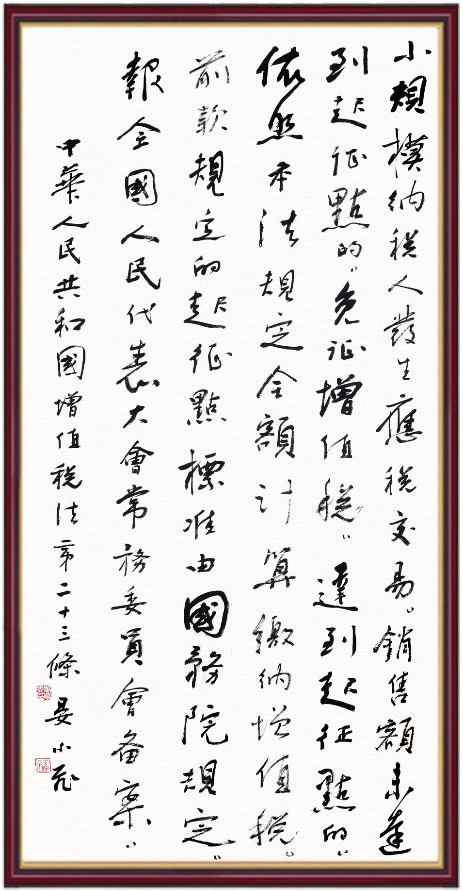 稅收一頭連著國(guó)計(jì),一頭連著民生。全面推進(jìn)依法治稅,是全面依法治國(guó)基本方略在稅收領(lǐng)域的集中體現(xiàn)?!吨腥A人民共和國(guó)增值稅法》將于2026年1月1日起施行,對(duì)全面落實(shí)稅收法定原則、健全有利于高質(zhì)量發(fā)展的增值稅制度、規(guī)范增值稅的征收和繳納、保護(hù)納稅人合法權(quán)益具有重要意義。繼書(shū)寫(xiě)《中華人民共和國(guó)民法典》《中華人民共和國(guó)憲法》《中華人民共和國(guó)國(guó)旗法》《中華人民共和國(guó)國(guó)徽法》《中華人民共和國(guó)國(guó)歌法》《中華人民共和國(guó)法官法》《中華人民共和國(guó)黃河保護(hù)法》等法律法規(guī)之后,法制日?qǐng)?bào)社將筆端對(duì)準(zhǔn)《中華人民共和國(guó)增值稅法》。