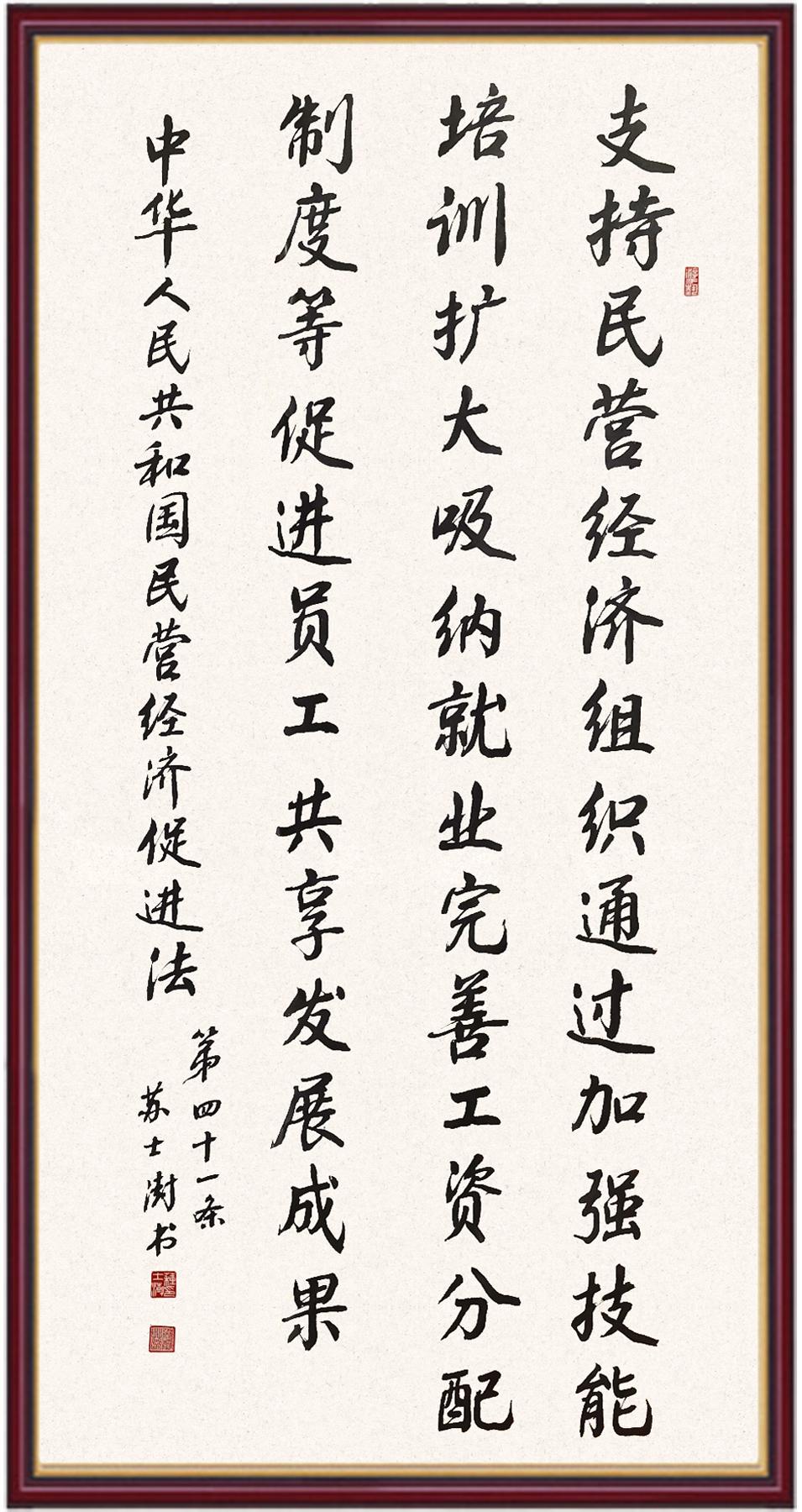 《中華人民共和國民營經(jīng)濟促進法》自今年5月20日起施行。作為我國首部專門關(guān)于民營經(jīng)濟發(fā)展的基礎(chǔ)性法律,民營經(jīng)濟促進法將支持和保障民營經(jīng)濟發(fā)展的法律制度融入中國特色社會主義法律體系,具有重大的法治意義,為促進民營經(jīng)濟持續(xù)、健康、高質(zhì)量發(fā)展提供了堅實的法治保障。為更好地學(xué)習(xí)、宣傳、貫徹這部法律,法治日報社聯(lián)合司法部普法與依法治理局,開展“‘書·法’系列活動之書寫《中華人民共和國民營經(jīng)濟促進法》”活動。