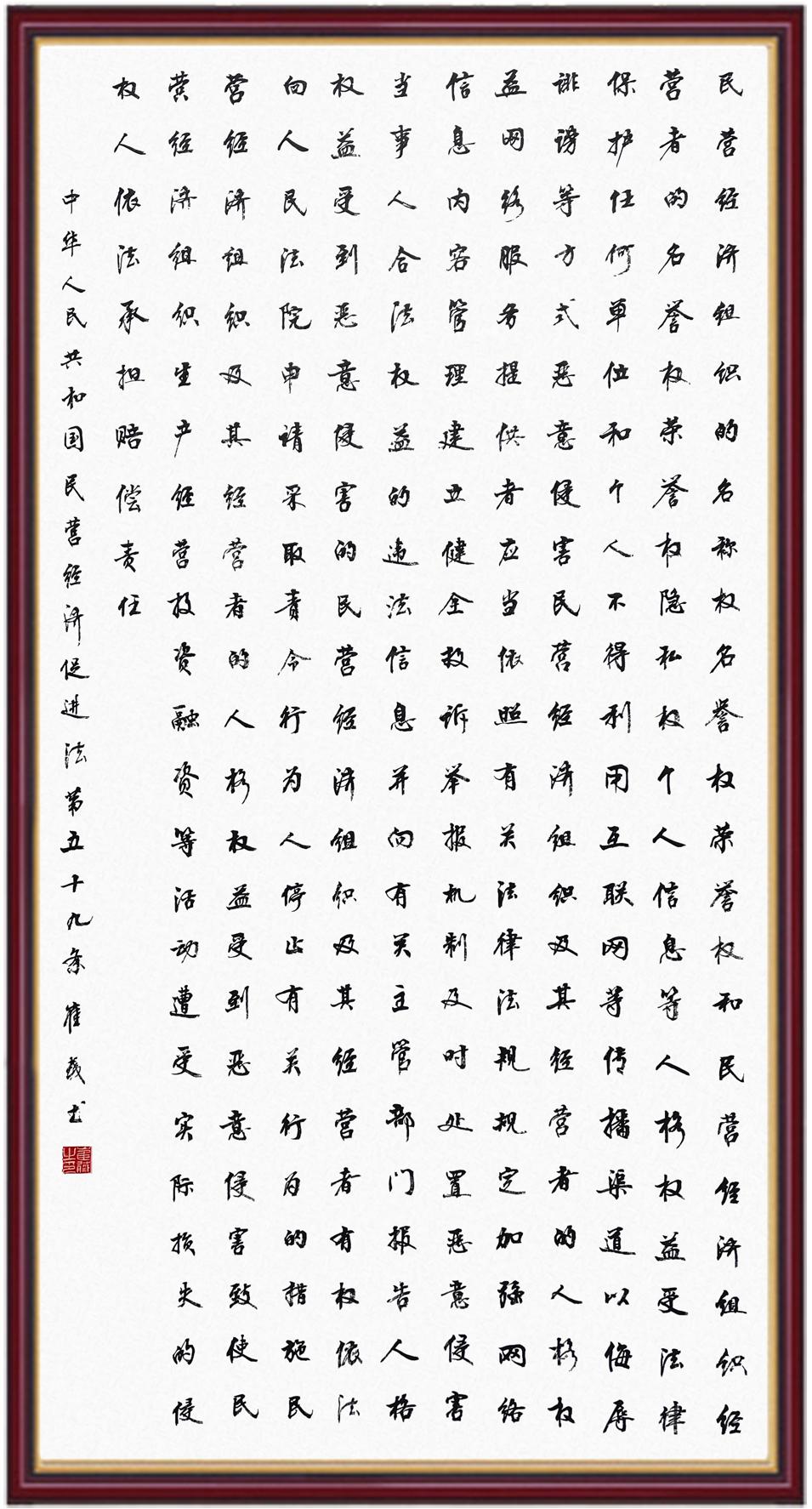 《中華人民共和國民營經(jīng)濟促進法》自今年5月20日起施行。作為我國首部專門關于民營經(jīng)濟發(fā)展的基礎性法律,民營經(jīng)濟促進法將支持和保障民營經(jīng)濟發(fā)展的法律制度融入中國特色社會主義法律體系,具有重大的法治意義,為促進民營經(jīng)濟持續(xù)、健康、高質(zhì)量發(fā)展提供了堅實的法治保障。為更好地學習、宣傳、貫徹這部法律,法治日報社聯(lián)合司法部普法與依法治理局,開展“‘書·法’系列活動之書寫《中華人民共和國民營經(jīng)濟促進法》”活動。