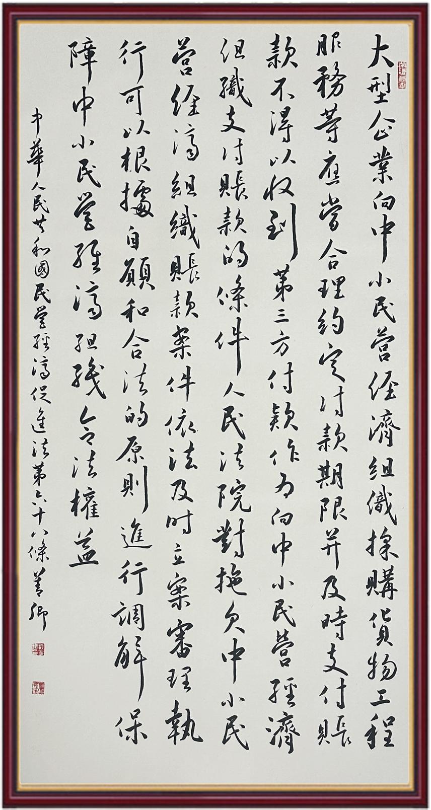 《中華人民共和國(guó)民營(yíng)經(jīng)濟(jì)促進(jìn)法》自今年5月20日起施行。作為我國(guó)首部專門關(guān)于民營(yíng)經(jīng)濟(jì)發(fā)展的基礎(chǔ)性法律,民營(yíng)經(jīng)濟(jì)促進(jìn)法將支持和保障民營(yíng)經(jīng)濟(jì)發(fā)展的法律制度融入中國(guó)特色社會(huì)主義法律體系,具有重大的法治意義,為促進(jìn)民營(yíng)經(jīng)濟(jì)持續(xù)、健康、高質(zhì)量發(fā)展提供了堅(jiān)實(shí)的法治保障。為更好地學(xué)習(xí)、宣傳、貫徹這部法律,法治日?qǐng)?bào)社聯(lián)合司法部普法與依法治理局,開展“‘書·法’系列活動(dòng)之書寫《中華人民共和國(guó)民營(yíng)經(jīng)濟(jì)促進(jìn)法》”活動(dòng)。