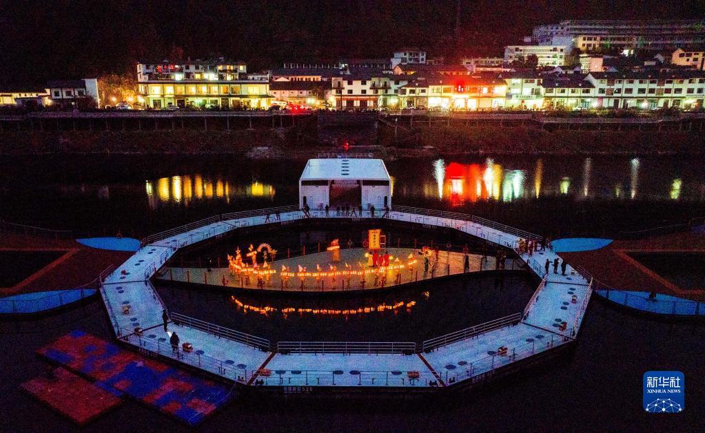 2月2日在浙江省杭州市淳安縣里商鄉(xiāng)拍攝的里商仁燈元宵表演(無人機照片)。