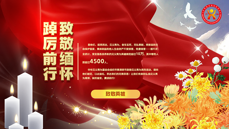 英雄們的行為和崇高精神為全社會作出了表率,樹立了榜樣,我們將一直銘記在心。此次清明節(jié)活動,請大家積極參與,向見義勇為獻出寶貴生命的英烈和犧牲人員網(wǎng)絡(luò)獻花,以此追憶,表達我們的無限哀思。讓我們踔厲奮發(fā)、賡續(xù)前行,以實際行動傳承和弘揚見義勇為精神,倡導(dǎo)見義勇為的社會風(fēng)尚,讓全社會正氣充盈、邪不可干,為建設(shè)更高水平平安中國、法治中國而奮斗。