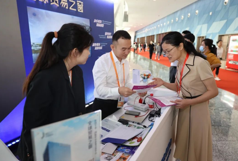 圖為海南一中院副院長(zhǎng)孔繁鴻走訪參展企業(yè),向參展企業(yè)代表介紹《條款》。