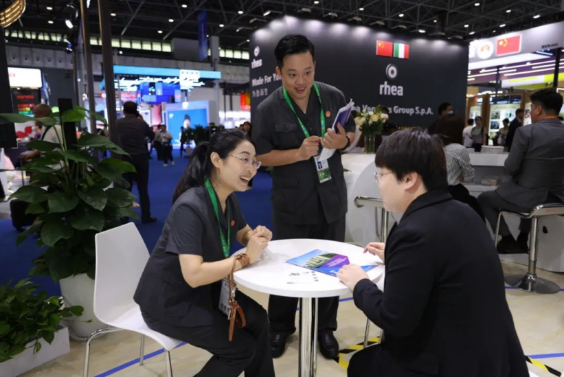 圖為海南一中院法官與參展企業(yè)代表溝通交流。