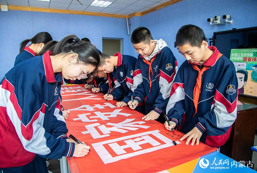 4月12日,內(nèi)蒙古呼和浩特市第二十六中學(xué)學(xué)生在“國家安全 人人有責(zé)”宣傳條幅上簽名。丁根厚 攝