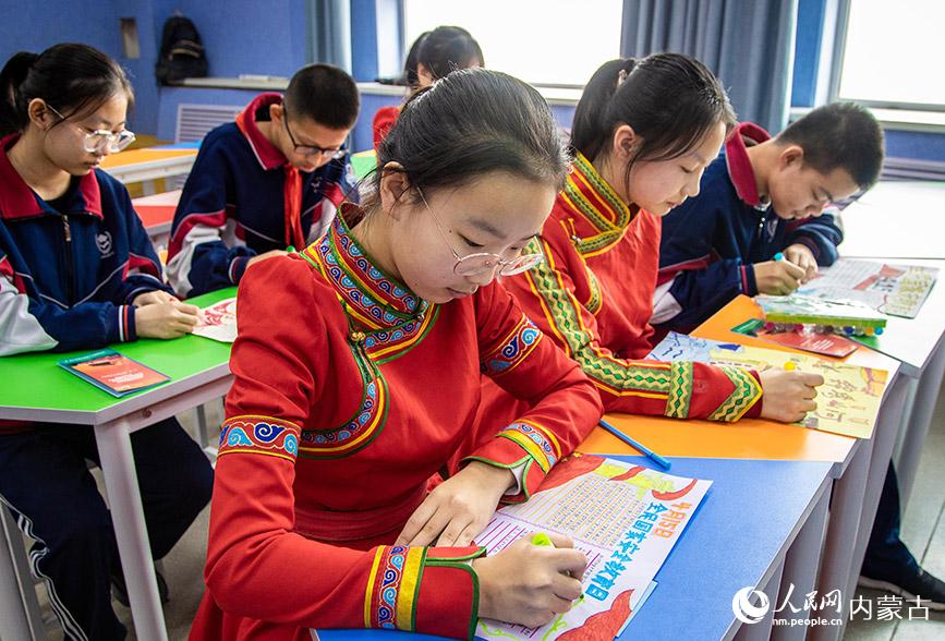 4月12日,內(nèi)蒙古呼和浩特市第二十六中學(xué)學(xué)生在繪制國家安全教育主題手抄報(bào)。丁根厚 攝