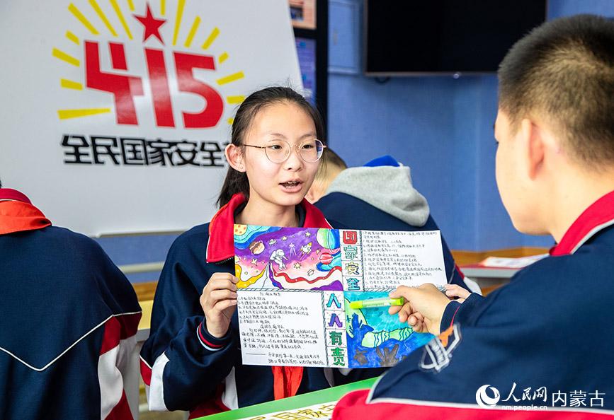 4月12日,內(nèi)蒙古呼和浩特市第二十六中學(xué)學(xué)生在展示繪制的國家安全教育主題手抄報(bào)。丁根厚 攝