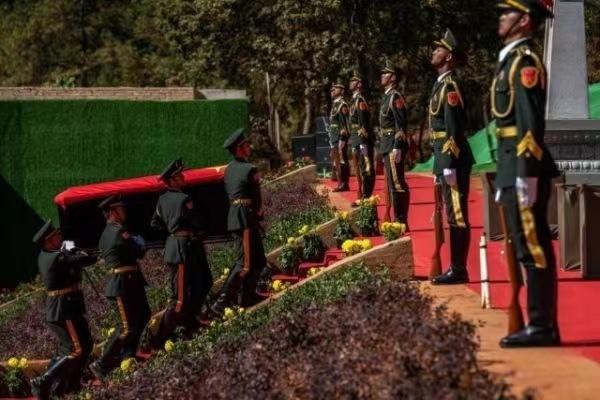 烈士陵園里,高聳的紀(jì)念碑引人注目。隨著烈士棺槨輕輕安放入墓,全體人員向烈士三鞠躬。隨后,現(xiàn)場(chǎng)的人們依次向烈士獻(xiàn)花致敬。