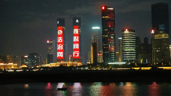 法治之光照亮美好生活。夜晚的南昌,一場(chǎng)大型燈光秀上演,在贛江兩岸標(biāo)志性建筑戶外LED大屏幕墻上,滾動(dòng)播放著網(wǎng)絡(luò)文明、網(wǎng)絡(luò)法治等主題宣傳標(biāo)語(yǔ)、動(dòng)圖、微視頻等,“e法治網(wǎng) 同心同行”的宣傳標(biāo)語(yǔ),更是吸引了眾多市民駐足觀看。