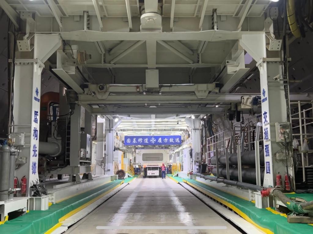 作為隧道內(nèi)初期路面的預(yù)制箱涵正在向前拼裝。新華社記者 溫競(jìng)?cè)A 攝