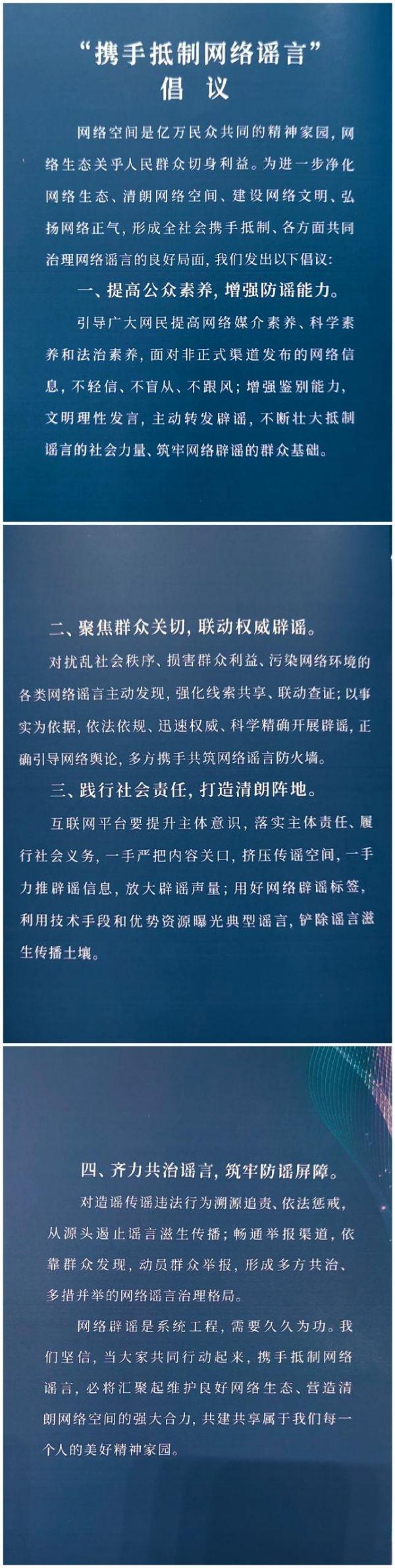 網(wǎng)絡(luò)空間是億萬民眾共同的精神家園,網(wǎng)絡(luò)生態(tài)關(guān)乎人民群眾切身利益。為進(jìn)一步凈化網(wǎng)絡(luò)生態(tài)、清朗網(wǎng)絡(luò)空間、建設(shè)網(wǎng)絡(luò)文明、弘揚(yáng)網(wǎng)絡(luò)正氣,形成全社會(huì)攜手抵制、各方面共同治理網(wǎng)絡(luò)謠言的良好局面,本次論壇發(fā)布了《“攜手抵制網(wǎng)絡(luò)謠言”倡議》。