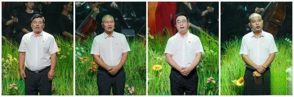 基層村干部鞏保雄(左一)、高泉偉(左二)、俞小平(右二)和施金通(右一)走上舞臺,深情講述《新時(shí)代——我做鄉(xiāng)村振興答卷人》