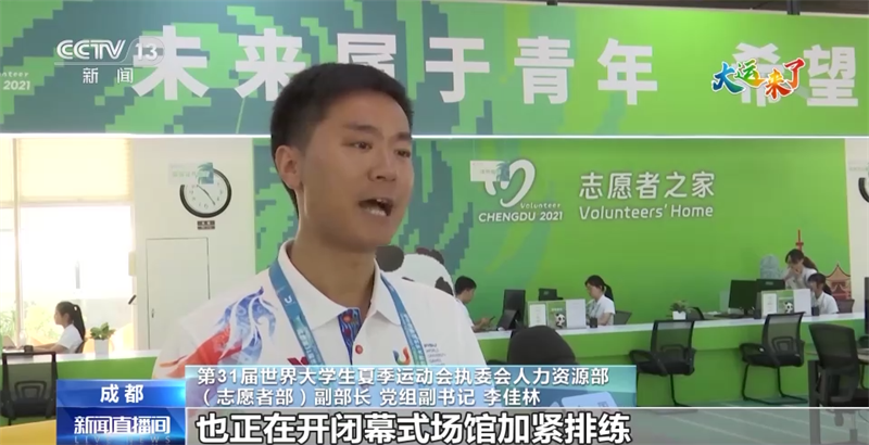 第31屆世界大學生夏季運動會執(zhí)委會人力資源部(志愿者部)副部長 黨組副書記 李佳林:最近隨著我們的世界各國代表團陸續(xù)抵達成都,我們350名代表團隨員志愿者已經開始上崗。另外,我們有3000名左右的演職類志愿者也正在開閉幕式場館加緊排練,為他們在開閉幕式的精彩表演全力以赴。所有的競賽場館的志愿者也都已經全部上崗,準備好迎接我們的大運會各項賽事的到來。