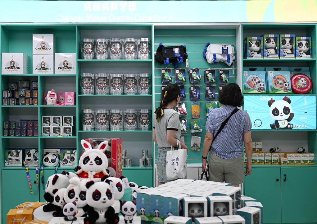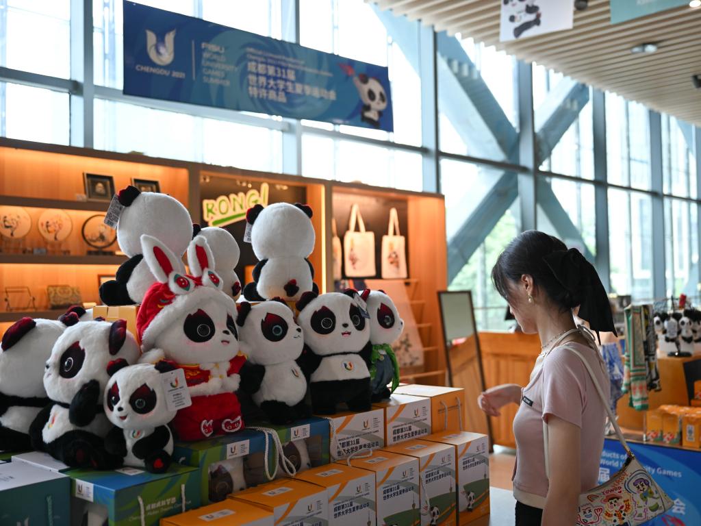 ↑7月18日,市民在成都大運會成都博物館官方特許商品零售店內(nèi)選購“蓉寶”公仔。