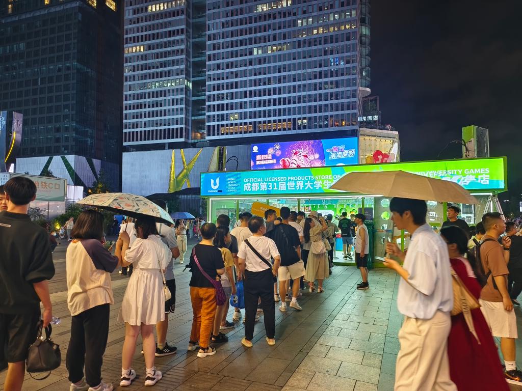 ↑7月27日,人們在成都市一家成都大運會特許商品零售店門前排隊。
