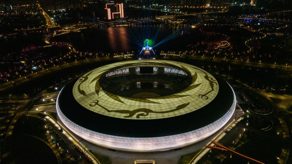 ↑這是4月19日拍攝的第31屆世界大學(xué)生夏季運動會開幕式主體育場及主火炬(無人機(jī)照片)