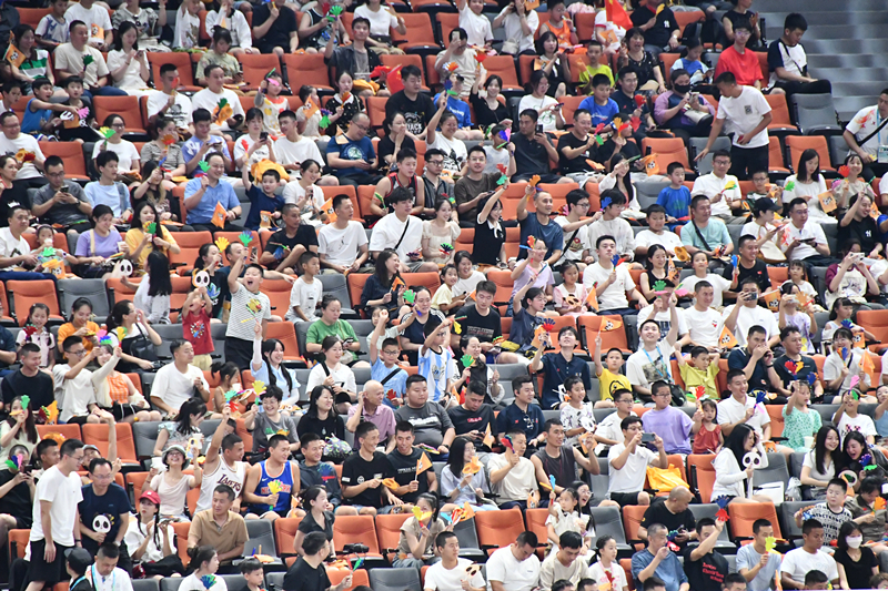 而像“成都成就夢(mèng)想”“蜀道開,大運(yùn)來”等語(yǔ)句,也被巧妙融進(jìn)了比賽現(xiàn)場(chǎng)。它們一般出現(xiàn)在暖場(chǎng)環(huán)節(jié),由主持人先喊“成都”或“蜀道開”,觀眾緊接“成就夢(mèng)想”或“大運(yùn)來”,每句一般喊2到3遍。渾厚統(tǒng)一又富有節(jié)奏的聲浪,既是宣傳成都最直接的方式,也給了本地觀眾強(qiáng)烈的身份認(rèn)同和自豪感。