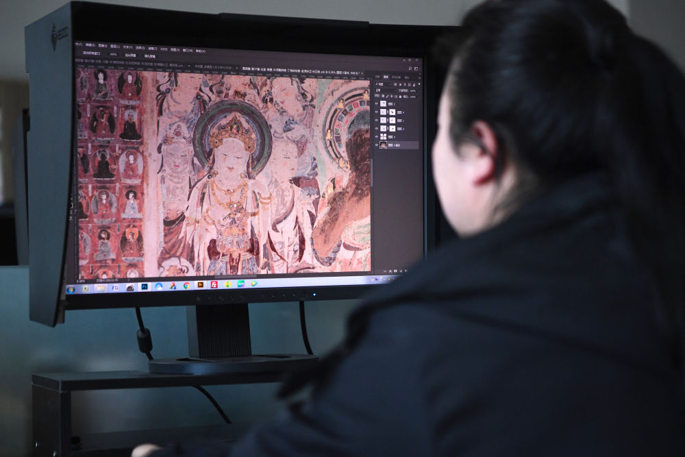 敦煌研究院文物數(shù)字化保護團隊圖像處理人員年海麗在拼接壁畫圖像(2023年4月25日攝)。數(shù)字化探索為莫高窟的保護與傳承開辟了全新路徑,數(shù)字技術(shù)讓敦煌文物走出洞窟,跨出國門,走向“永久保存、永續(xù)利用”。新華社記者 陳斌 攝