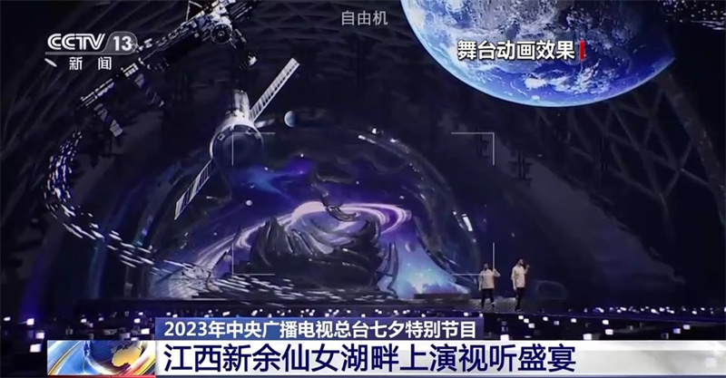 今年的七夕特別節(jié)目融入了傳統(tǒng)戲曲、民樂、非遺技藝等優(yōu)秀傳統(tǒng)文化元素,在歌曲《銀河逃離計(jì)劃》中,利用AR拍攝“太空旅行”,為觀眾構(gòu)建關(guān)于太空的可視化想象;在現(xiàn)場歌手與云端合唱《甜蜜蜜》中,借七夕節(jié)展現(xiàn)“一帶一路”中國同沿線國家建立浪漫深厚聯(lián)結(jié)的十周年。