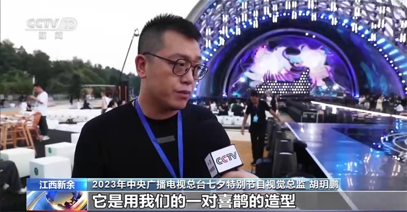 2023年中央廣播電視總臺(tái)七夕特別節(jié)目視覺總監(jiān) 胡玥鵬:整個(gè)主舞臺(tái)的LED屏,用一對喜鵲的造型來作為主造型,每個(gè)節(jié)目都要依據(jù)我們現(xiàn)在舞美的造型來做設(shè)計(jì)。同時(shí)我們設(shè)計(jì)了一個(gè)新媒體互動(dòng)裝置的樹,來作為整個(gè)舞臺(tái)的前景,它既承載著一個(gè)表演空間,又有很好的一個(gè)寓意。