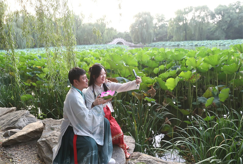 8月20日,身著漢服的游客手拿荷燈合影。中國日報記者 鄒紅 攝