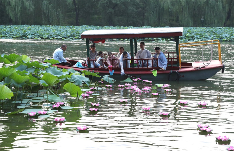 8月20日,游客放荷燈寄托對美好生活的祝愿。中國日報記者 鄒紅 攝