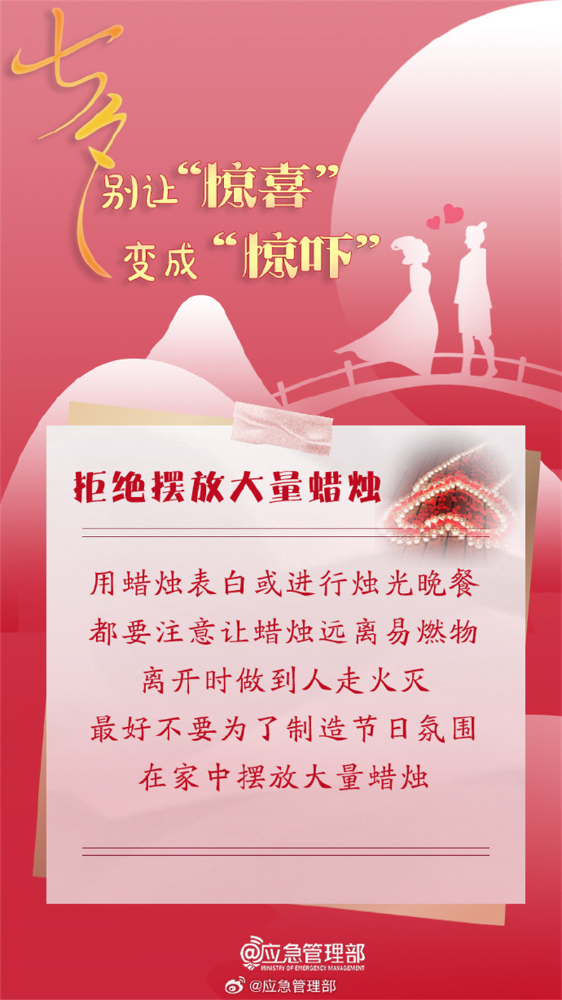 你打算怎么過(guò)七夕呢?燭光晚餐、蠟燭表白、燃放煙花……不論如何,在享受浪漫的同時(shí),千萬(wàn)別忘了消防安全~快和你的愛人一起了解吧↓↓