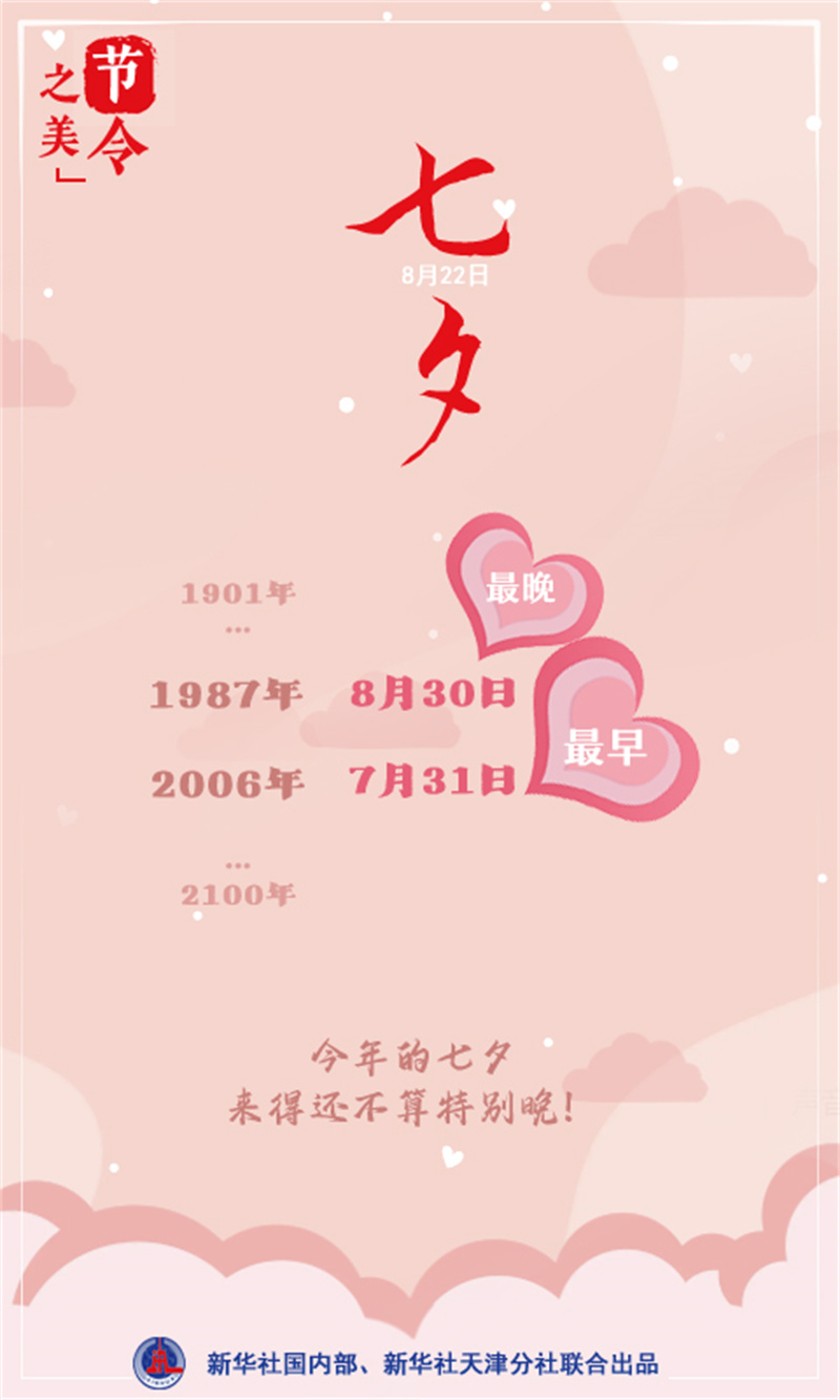 今年的七夕是來(lái)得最晚的嗎?不是!1901年至2100年這200年的統(tǒng)計(jì)結(jié)果顯示,七夕對(duì)應(yīng)的公歷日期最早可落在7月31日(如2006年),最晚可落在8月30日(如1987年),這也意味著,公歷7月31日至8月30日中的任何一天都有可能成為七夕。照此來(lái)看,今年的七夕來(lái)得還不算特別晚。