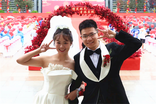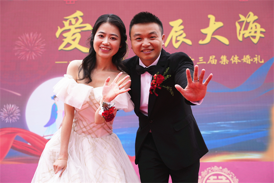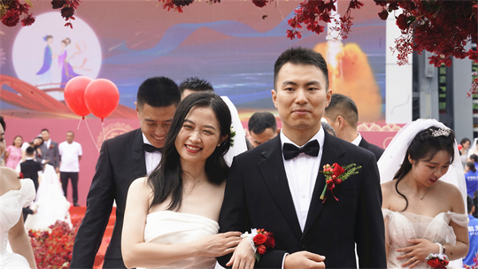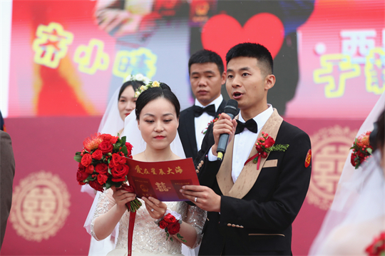 舞臺(tái)、氣球精心裝扮,美景、佳人喜迎幸?!槎Y現(xiàn)場(chǎng),新郎們身著深色西裝,筆挺英俊;新娘們身穿潔白婚紗,美麗動(dòng)人。一個(gè)個(gè)精心設(shè)置的儀式,一張張洋溢幸福的笑臉,讓這場(chǎng)集體婚禮甜蜜加倍、幸福爆表。