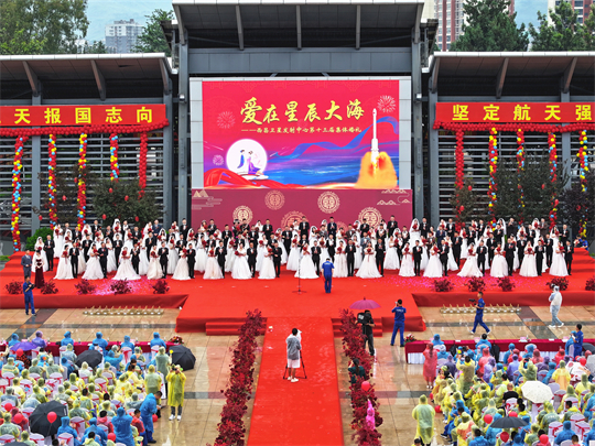 “星辰大海,夢(mèng)想自有夢(mèng)想的力量,仰望在銀河的想象,我們起航……”活動(dòng)最后,全體新人與觀禮人員共同合唱《星辰大?!?。愛(ài)在星辰大海,新人們把愛(ài)的誓言唱響在航天大院,幸福的歌聲在青山之間久久回蕩……