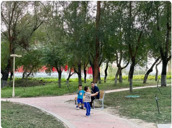 8月30日傍晚時(shí)分,記者來到新疆哈密市哈密河國家濕地公園。在其中的人民公園,樹木成蔭,水聲潺潺,涼爽宜人,不少市民正在鍛煉、休閑。