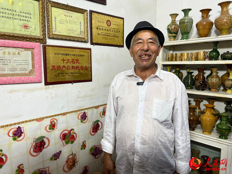 國家級非物質文化遺產模制法土陶燒制技藝傳承人阿卜杜熱合曼·麥麥提敏為記者介紹他獲得的榮譽。人民網記者 常雪梅攝