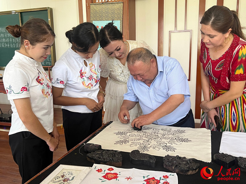 國家級非物質文化遺產模戳印花布技藝傳承人吾吉阿西木·吾舒爾展示模戳印花布的制作過程。人民網記者 常雪梅攝
