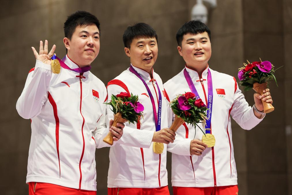 9月25日,男子25米手槍速射爭奪中,王鑫杰、劉楊攀、李越宏組成的中國隊以1765環(huán)的破世界紀(jì)錄成績奪得團(tuán)體冠軍。
