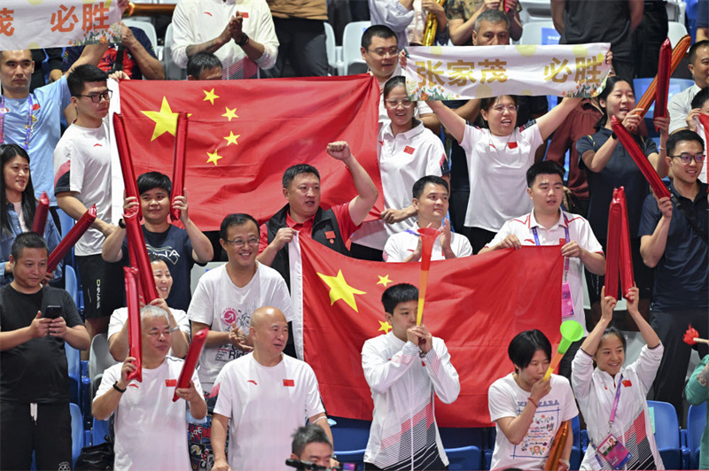 9月28日,觀眾為杭州亞運(yùn)會(huì)拳擊項(xiàng)目參賽選手加油。新華社記者 詹彥 攝
