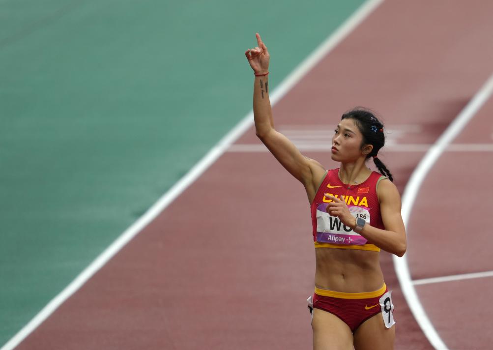 9月30日,中國選手吳艷妮在田徑項(xiàng)目女子100米欄預(yù)賽比賽后慶祝。新華社記者 江文耀 攝