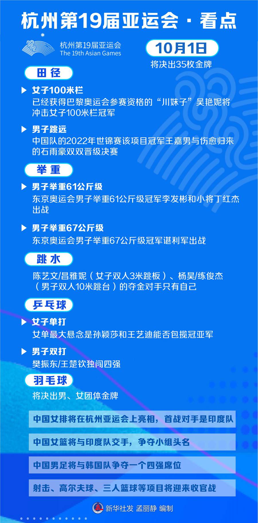 新華社杭州9月30日電(記者王恒志 張澤偉)杭州第19屆亞運(yùn)會(huì)10月1日將決出35枚金牌,恰逢國慶,中國體育健兒將在多個(gè)項(xiàng)目上沖擊金牌。田徑賽場“顏值擔(dān)當(dāng)”吳艷妮將挑戰(zhàn)自己的首個(gè)亞運(yùn)會(huì)冠軍,中國女排將迎來首場比賽,跳水、舉重、乒乓球等幾支“夢之隊(duì)”也將繼續(xù)登場。