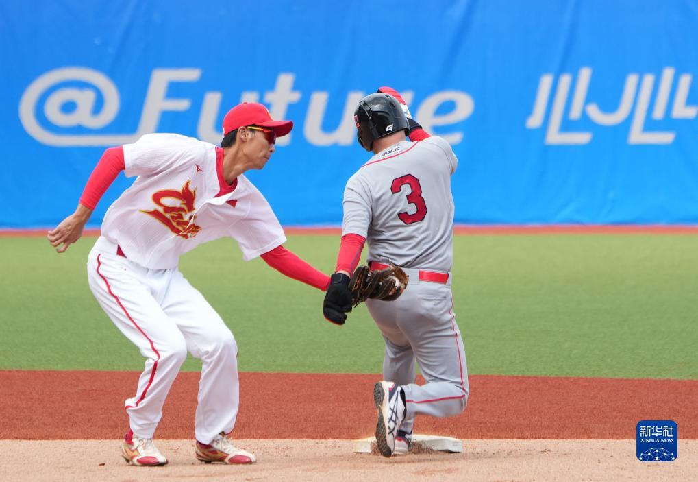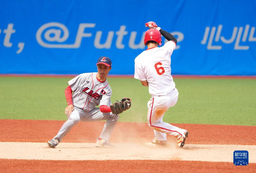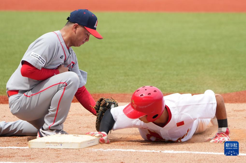 10月1日,中國(guó)隊(duì)球員梁培(右)在比賽中搶壘。