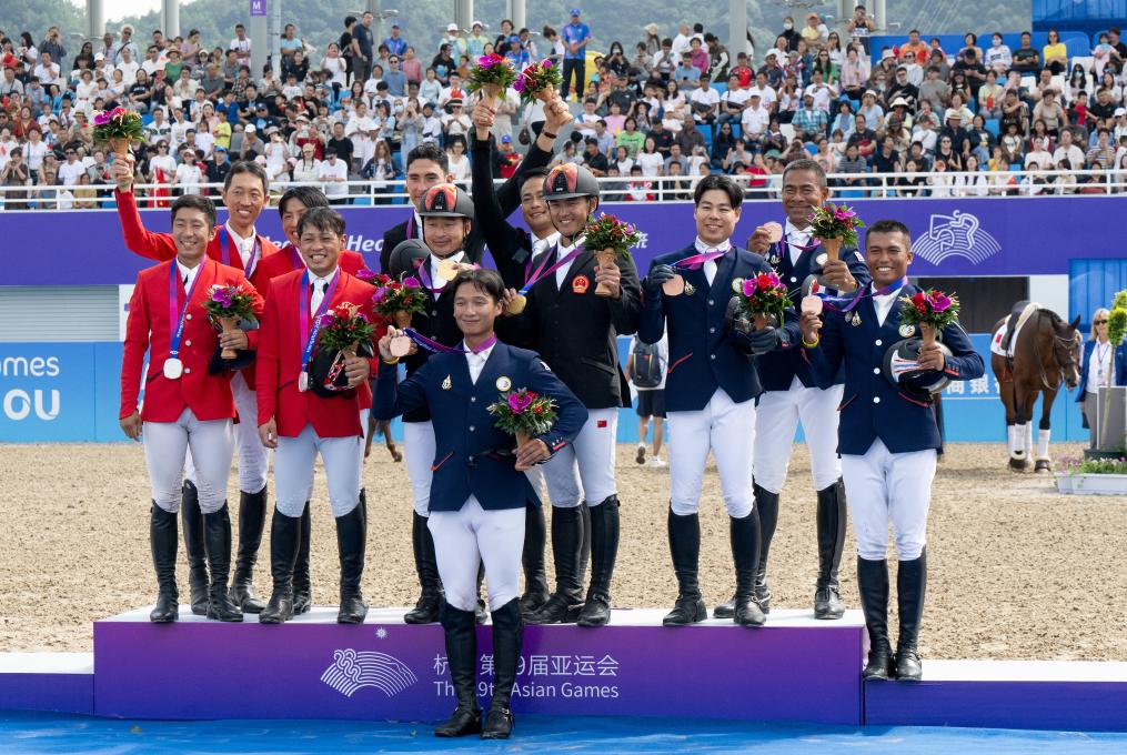 10月2日,在桐廬馬術(shù)中心舉行的杭州亞運(yùn)會馬術(shù)項(xiàng)目三項(xiàng)賽團(tuán)體賽結(jié)束。中國隊(duì)獲得冠軍,日本隊(duì)和泰國隊(duì)分獲亞軍、季軍。新華社記者 魏培全 攝